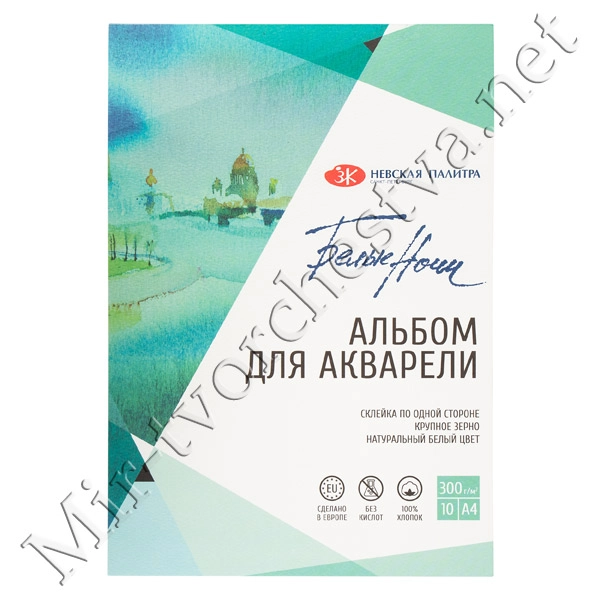 Альбом-склейка для акварели, А4, плотность 300 г/м2, 10 листов, 100% хлопок, крупное зерно, Белые Ночи
