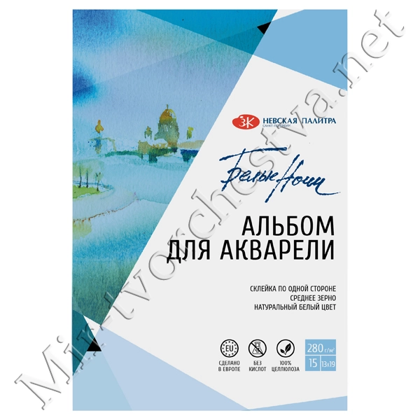 Альбом-склейка для акварели, 13х19 см, плотность 280 г/м2, 15 листов, 100% целлюлоза, среднее зерно, Белые Ночи