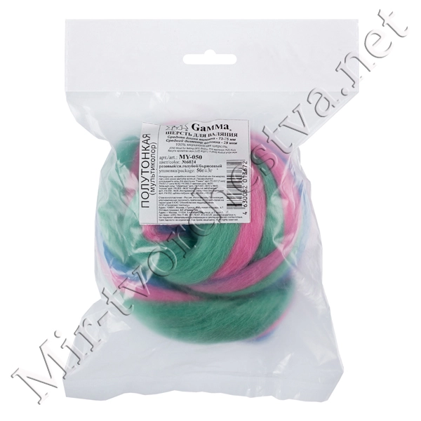 Шерсть для валяния полутонкая (микс), Розовый/Светло голубой/Бирюзовый (6024), 50г, Gamma
