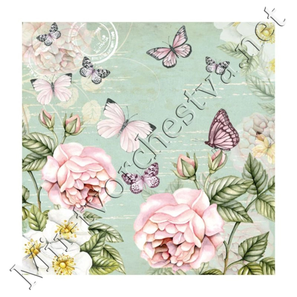 Декупажная салфетка "Цветы и бабочки", зеленые, 33*33 см, 18,5 г/м2, Abiente