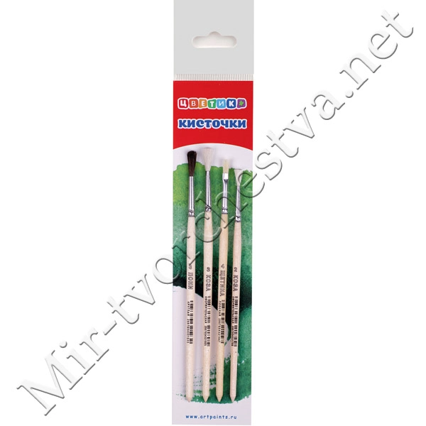 Набор кистей № 9 (4 шт): щетина плоская № 6, белка круглая № 1, пони круглая № 1, № 3, Цветик
