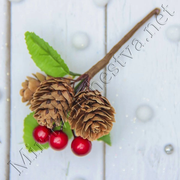 Декор для творчества "Веточка с 3-мя шишками и 3-мя ягодками" 7.5см