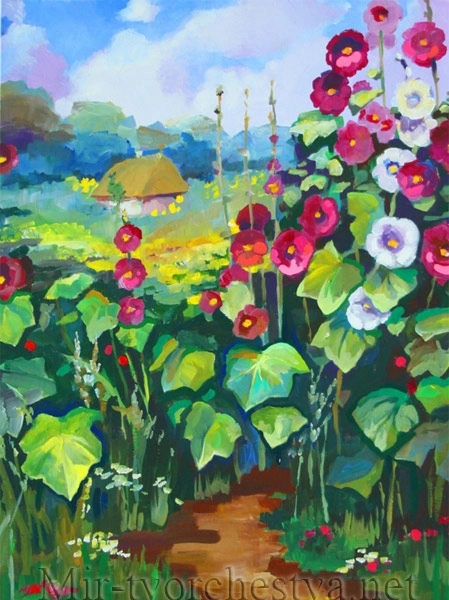 Холст на картоне с контуром, Натюрморт № 14, "Мальвы", 30*40, хлопок, акрил, Этюд